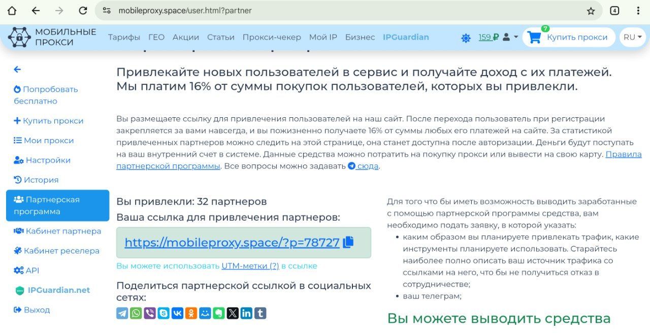 Для тех кто предпочитает не покупать прокси и доступ к приложениям с ИИ, а зарабатывать на этом, рекомендую сервис, на MobileProxy доступна партнерская программа с весьма щедрыми условиями: 16% от суммы любых платежей привлеченного пользователя будет пожизненно падать на счет партнера. За статистикой можно следить в соответствующем разделе личного кабинета, а для начала работы с партнеркой там же есть уже готовые промо-материалы.
